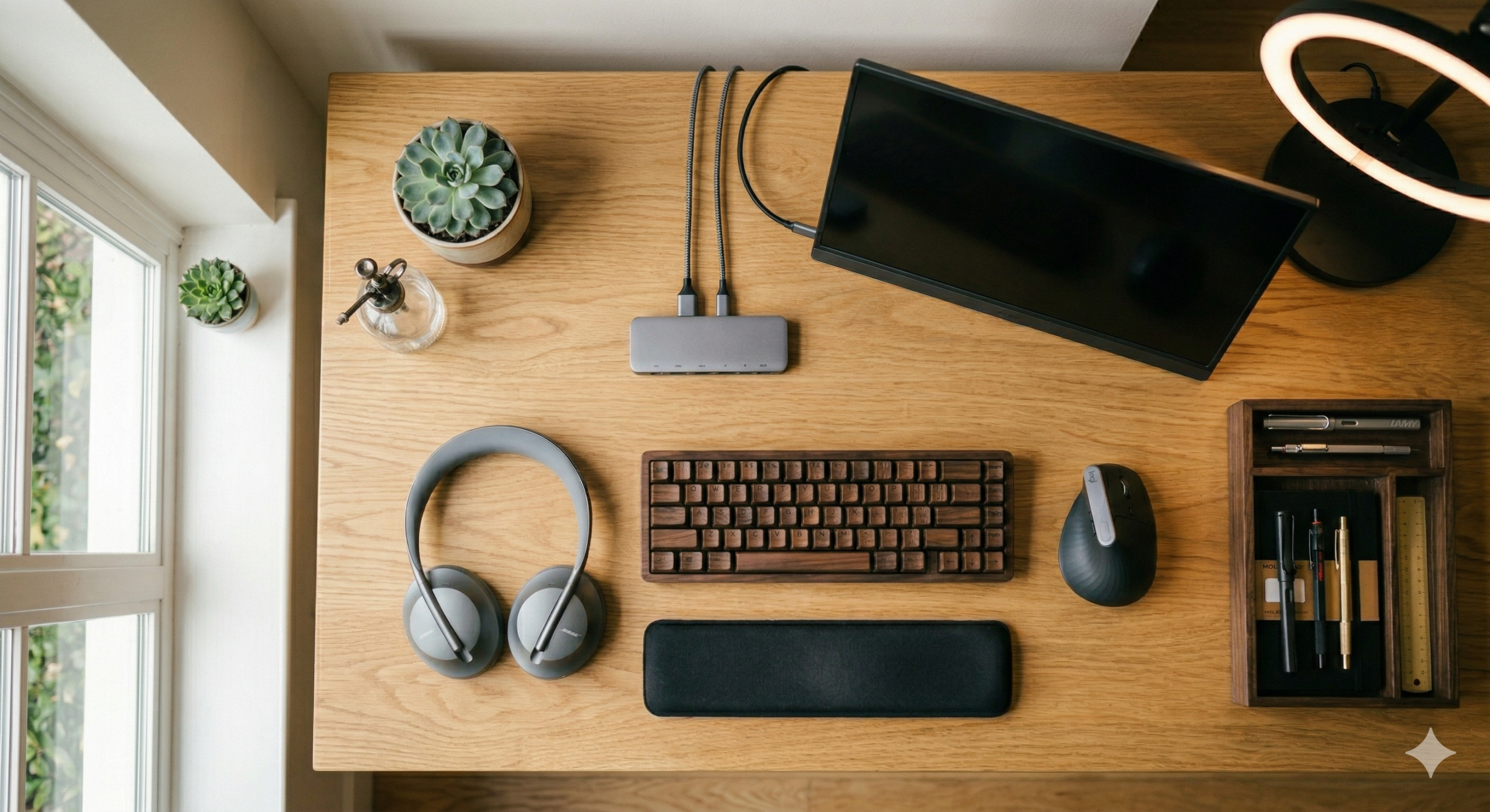NASAの研究では、室内に植物があるとストレスホルモンが軽減されることが報告されています。ポトスやサンスベリアなど手入れが簡単な観葉植物をデスクに置くだけで、リラックス効果が得られます。
