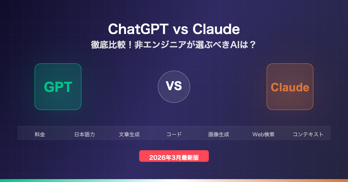 この記事では、ChatGPTとClaudeを料金・日本語力・機能・使いやすさなど7つの項目で徹底比較し、非エンジニアの視点から「どんな人にどちらがおすすめか」を具体的に解説します。