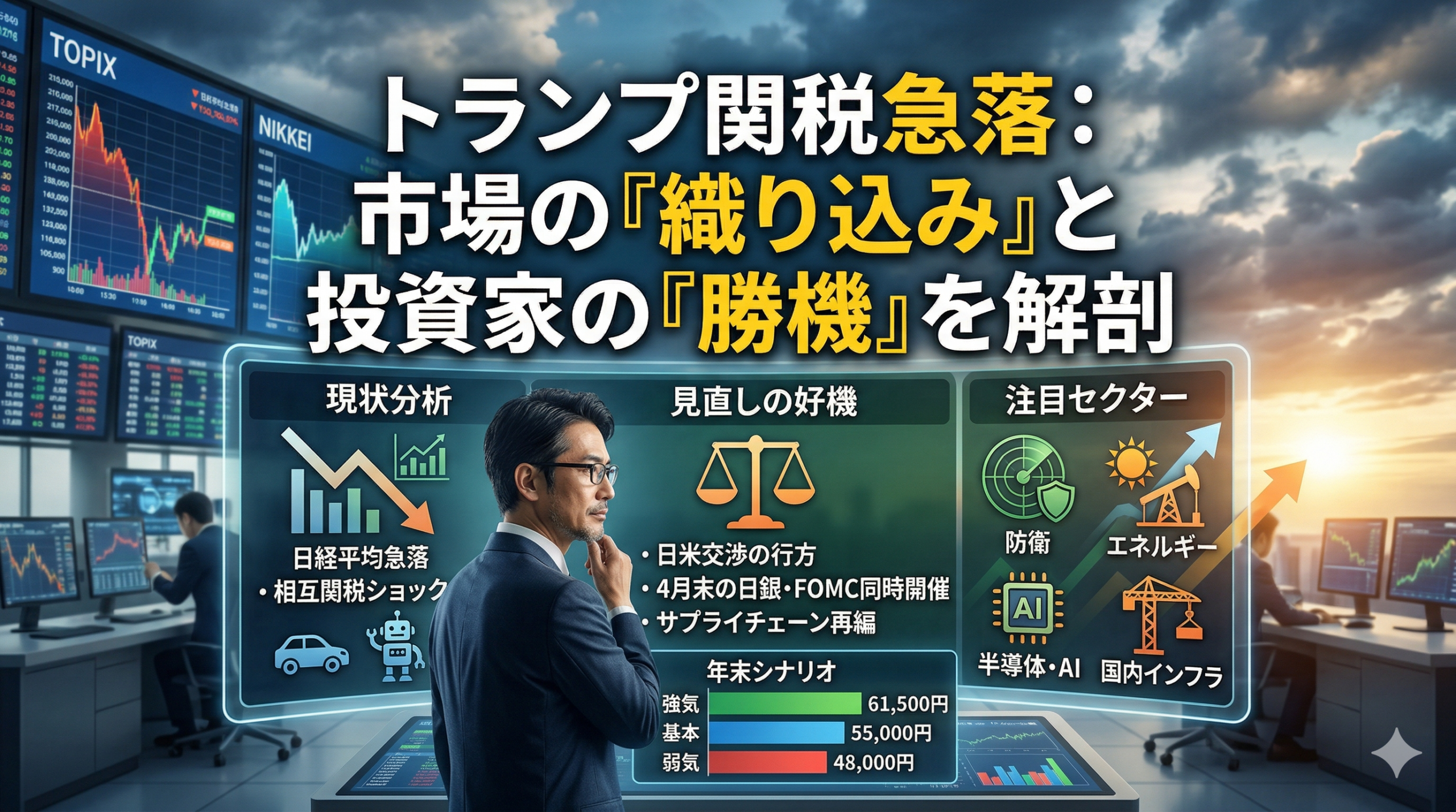 4月2日、トランプ大統領が打ち出した「相互関税」は、市場参加者の想定を大きく上回るものだった。日本経済新聞はこれを「最悪シナリオ」と表現し、TOPIXは関税発表前の2,800前後から数日で2,560前後へと約8〜9%急落。日経平均も一時5万円を割れる場面を見せた。
